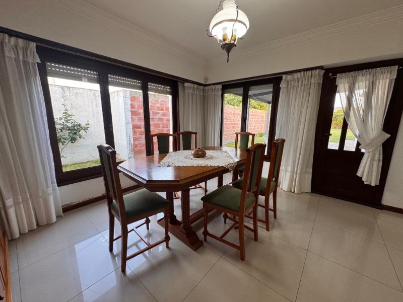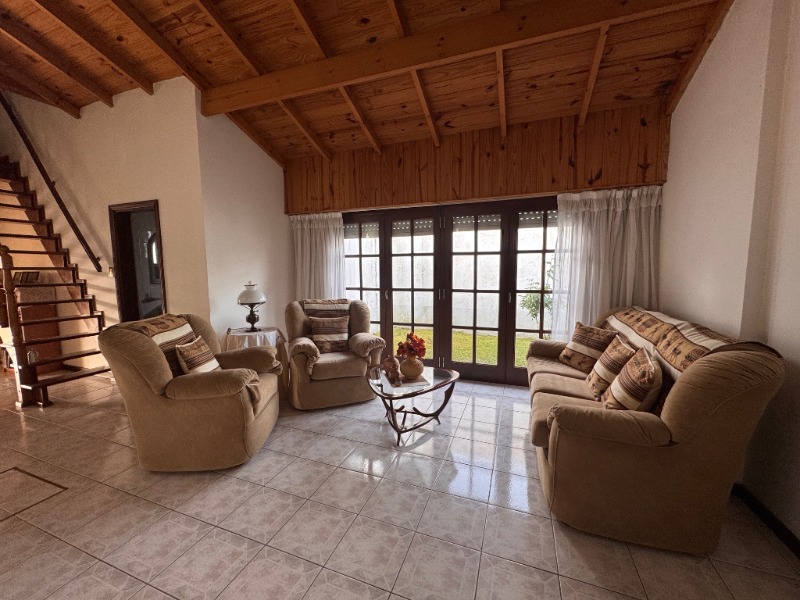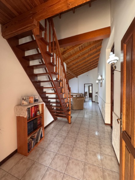 Planta Baja: al ingreso nos encontramos con un Living con hogar a leña, escalera a la vista con baranda en hierro, baño con ante-baño, para luego pasar al comedor muy luminoso con vista al parque que posee salamandra, la cocina integrada cuenta con bajomesadas y alacenas que tambien comunica a un amplio quincho con parrilla con espacio para lavarropas, amplios ventanales de luminosidad y salida al patio donde se encuentra la piscina con césped sintético y baño, acceso mediante escalera a la Terraza y garage semi-cubierto con trotadora y doble reja.